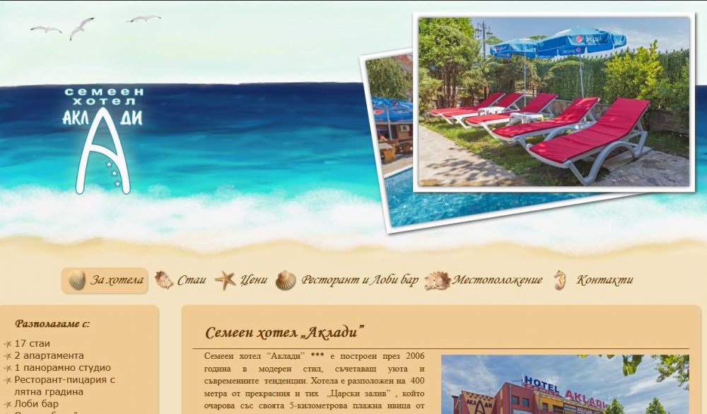 Самият облик на сайта http://hotelakladi.com предизвиква приятни мисли за хубава почивка и отдих на плажа. Тук ще намерите информация как да се свържете с хотела; за неговото разположение; стаите, които предлага; ресторанта; лоби бара и други. Снимките от галерията ще Ви помогнат да добиете представа за хотела и да се потопите в неговата приятна атмосфера.